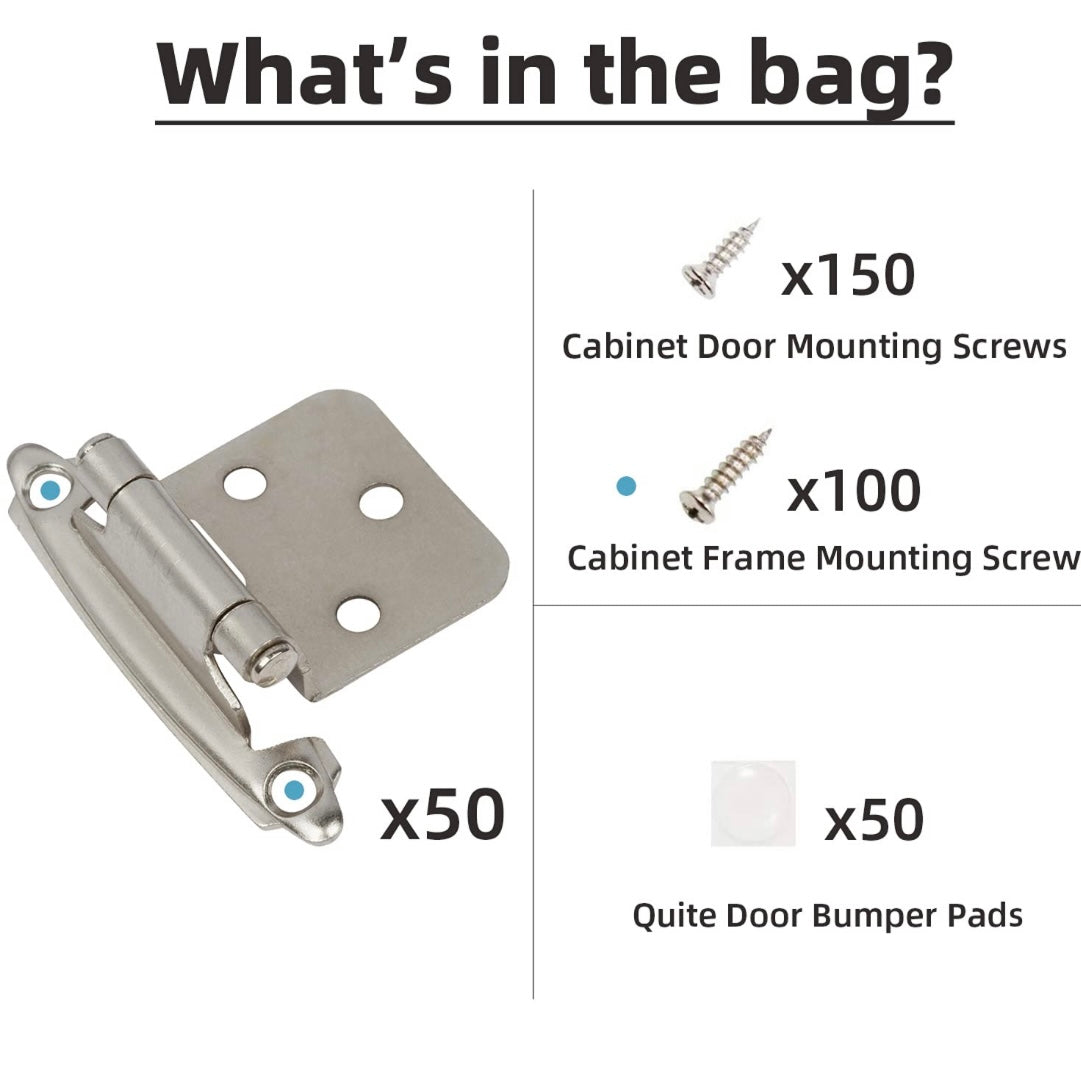 Améliorez vos armoires de cuisine avec les charnières d'armoire DecoBasics. Ce lot de 50 (25 paires) de charnières à fermeture automatique présente une finition élégante en nickel brossé satiné et un revêtement de 1/2 pouce pour un ajustement parfait. Fabriquées avec des matériaux de haute qualité et comprenant des pare-chocs en silicone, ces charnières offrent durabilité et protection supplémentaire. Améliorez vos armoires dès aujourd'hui !
