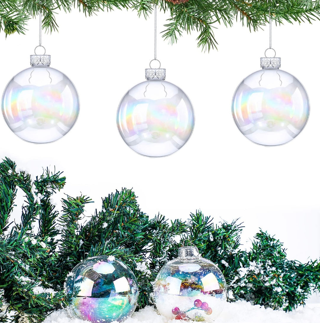 Créez une atmosphère colorée et festive avec nos 12 décorations de Noël en plastique transparent irisé. Ces boules suspendues de 4 pouces ont une apparence de couleur arc-en-ciel et sont fabriquées en plastique durable. Chacune est livrée avec une ficelle argentée et un couvercle supérieur en aluminium, ce qui les rend réutilisables pour les années à venir. Remplissez-les de flocons de neige, de baies de houx ou de vos propres décorations fantaisie pour une touche personnalisée.