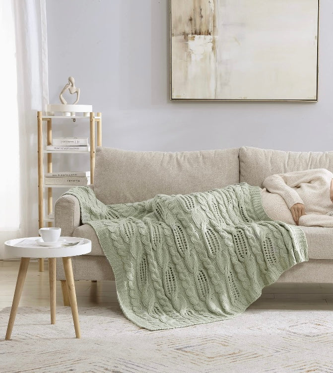 Amelie Home Sage Green Cable Knit Chenille Throw Blanket. Hollow cable knit pattern and super soft material, this blanket is lightweight and breathable, adding warmth and elegance to any space. Dimension: 50" x 60" - Machine washable with low heat recommended.