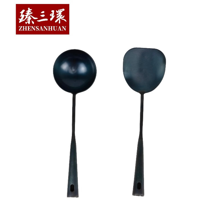 ZhenSanHuan Chinese Traditional Handmade Iron Spatula & Ladle Set. This 2-piece tool set features traditional Chinese craftsmanship with a durable design and long handles for easy use. Made from hand-crafted iron, the spatula and ladle are of the highest quality and should be dried after washing to prevent rusting. Not dishwasher safe.