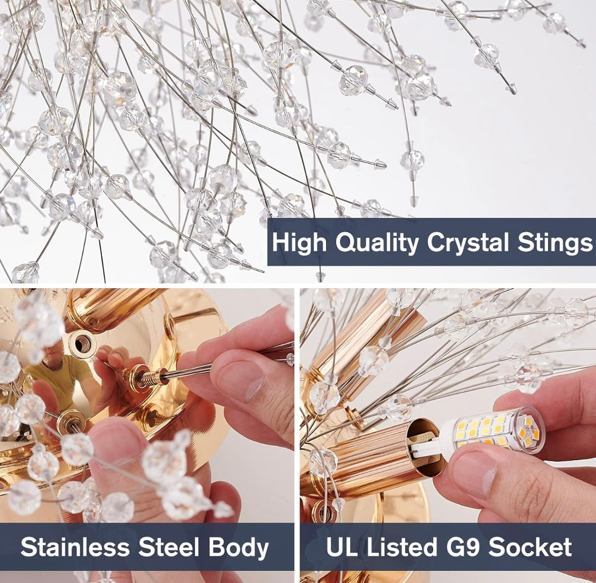 Light up your space with the Sputnik Flush Mount Light by CM MZY brand! This playful fixture features six G9 bulbs (sold separately) perched on gold metal branches sparkling with crystal beads, creating a dazzling firework effect. Rust-resistant and perfect for indoor use, it’s ideal for living rooms, bedrooms, dining rooms, hallways, entryways, or offices. Measuring 20" by 20" and 12" high, it works with dimmable switches so you can brighten up your day or set a cozy mood with ease. Add a fun, elegant sparkle to any room!